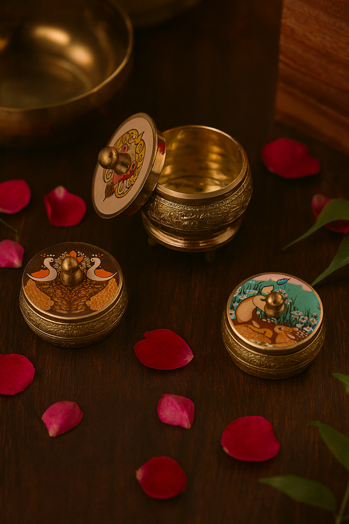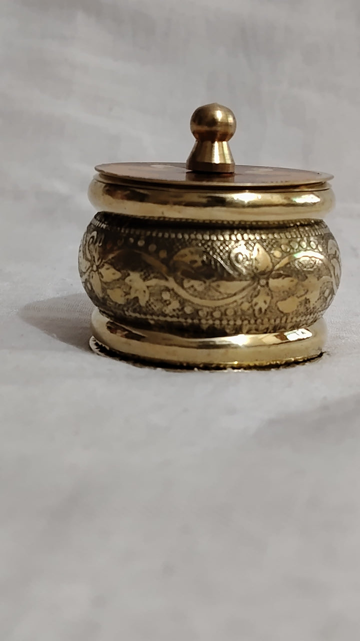 These elegant sindoor dibbis are made of light brass metal and finished with a rustic look, giving them a traditional charm. Each dibbi comes with a decorative lid design, making them not only functional but also visually appealing.
