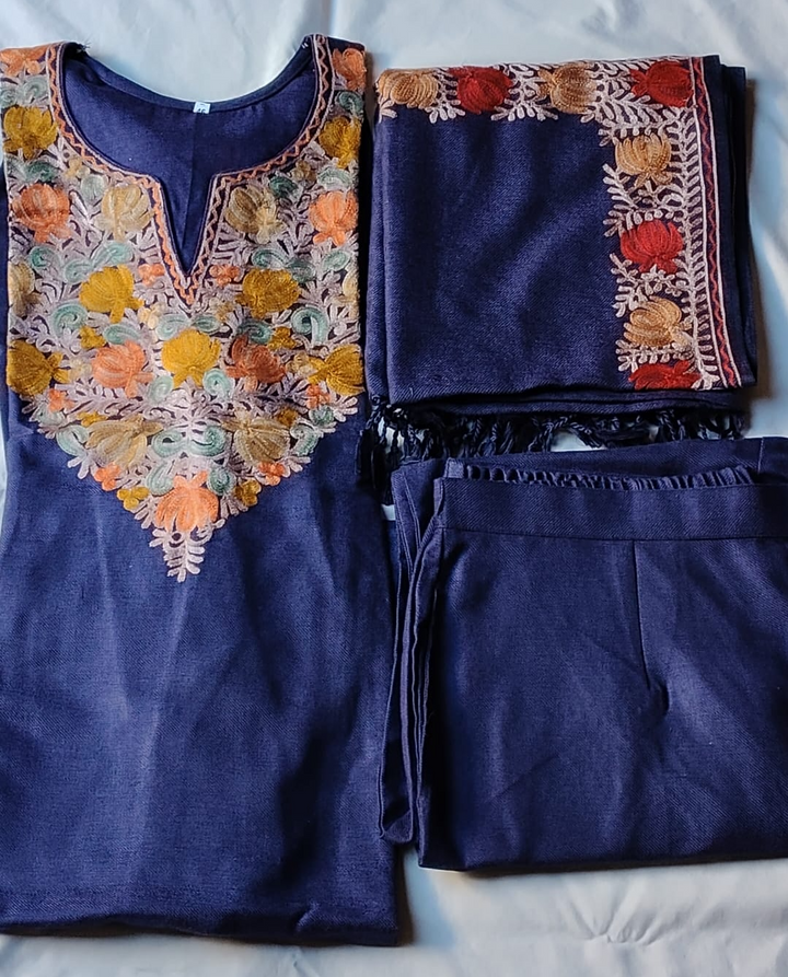 ✨ Fabric Highlight:Soft woolen fabric in an elegant midnight blue shade, adorned with Kashmiri style embroidery in pastel peach, mustard, and light green tones around the neckline. The woolen shawl features matching embroidery along the border, making it both warm and stylish. 🌸 Product Summary:This suit combines winter comfort with...