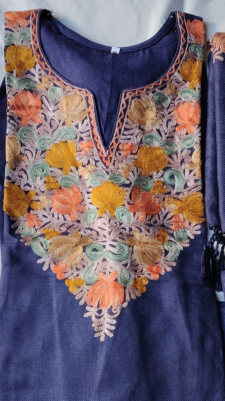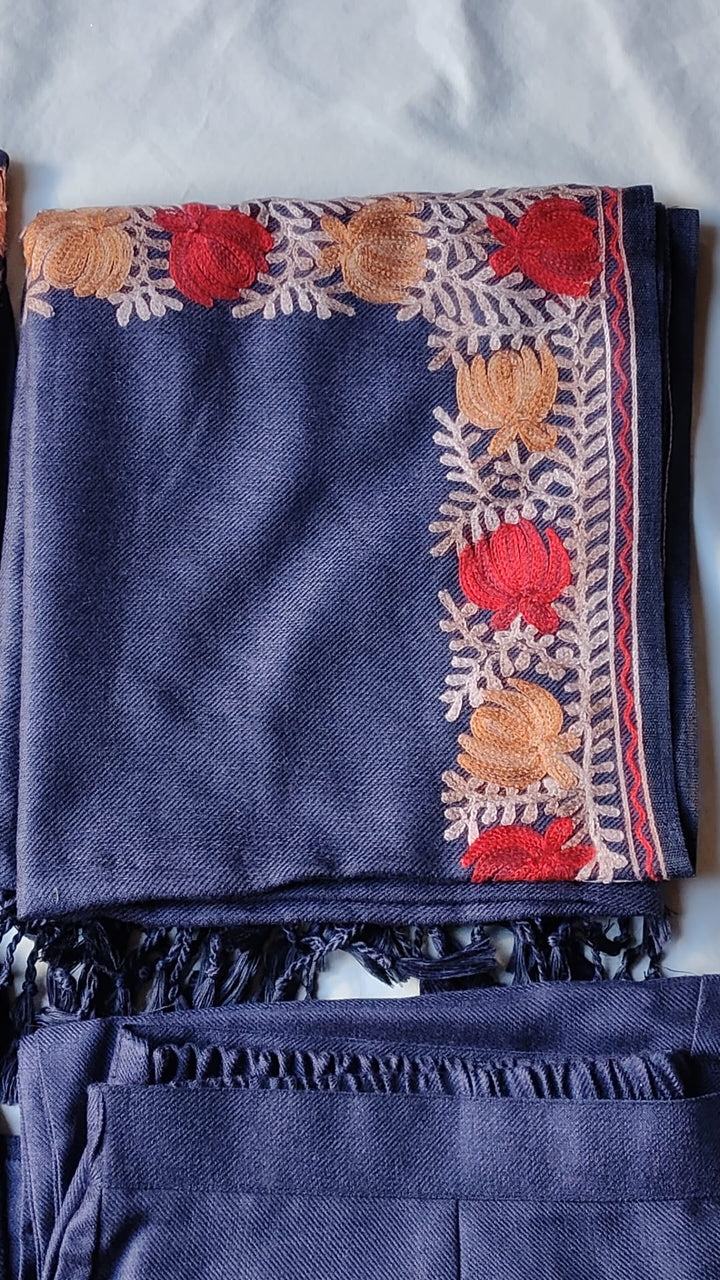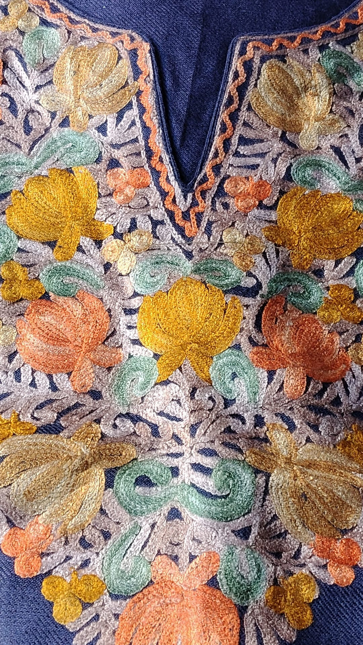 Soft woolen fabric in an elegant midnight blue shade, adorned with Kashmiri style embroidery in pastel peach, mustard, and light green tones around the neckline. The woolen shawl features matching embroidery along the border, making it both warm and stylish.