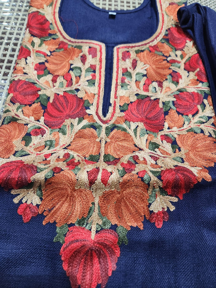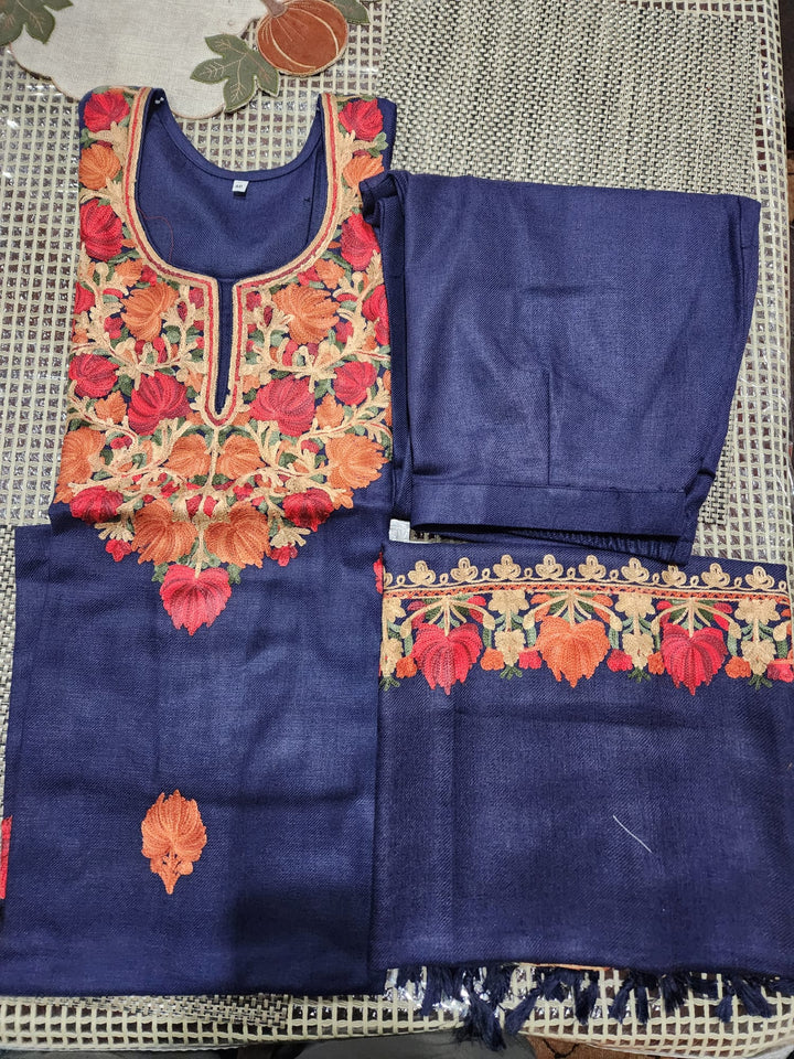 Made from warm, soft wool, this suit features a deep royal blue base with beautifully done Kashmiri-style floral embroidery around the neckline. The accompanying woolen shawl carries a matching embroidered border, giving it a graceful, coordinated finish.