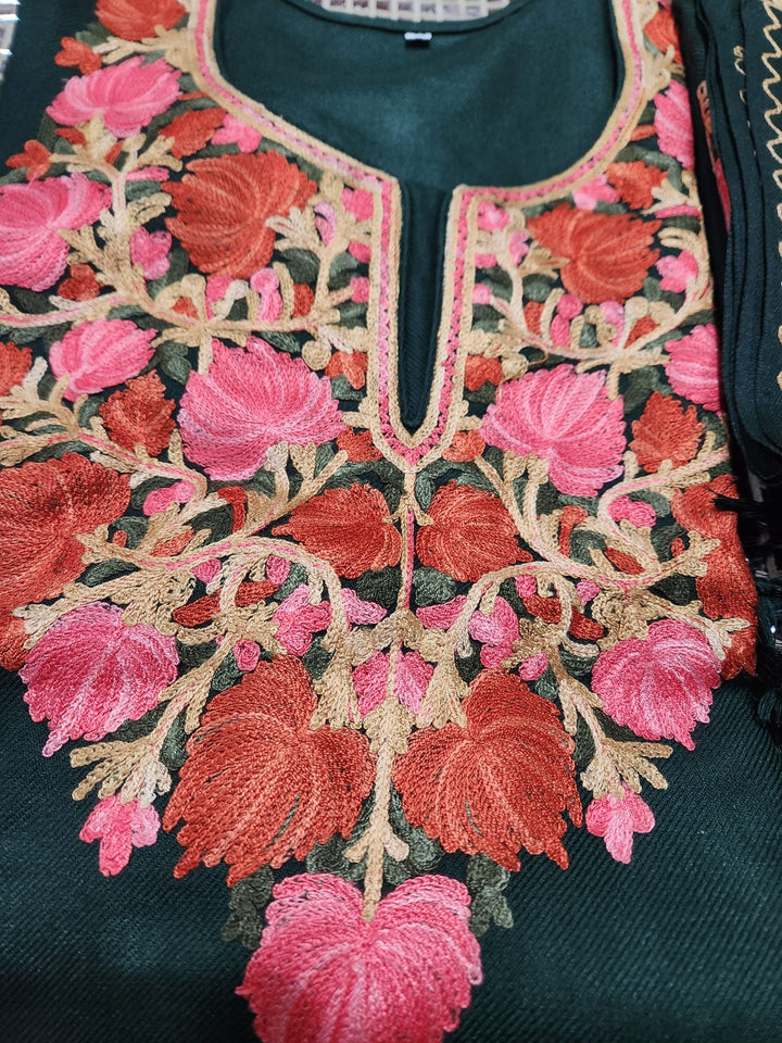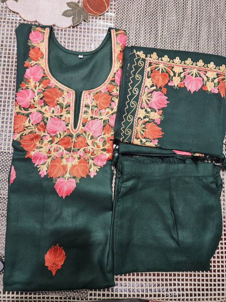 Warm and soft woolen fabric in a rich bottle green shade, exquisitely embroidered in Kashmiri style with vibrant red, orange, and pink floral motifs accented with golden threadwork. The embroidery graces the neckline, kurta front, and shawl borders.