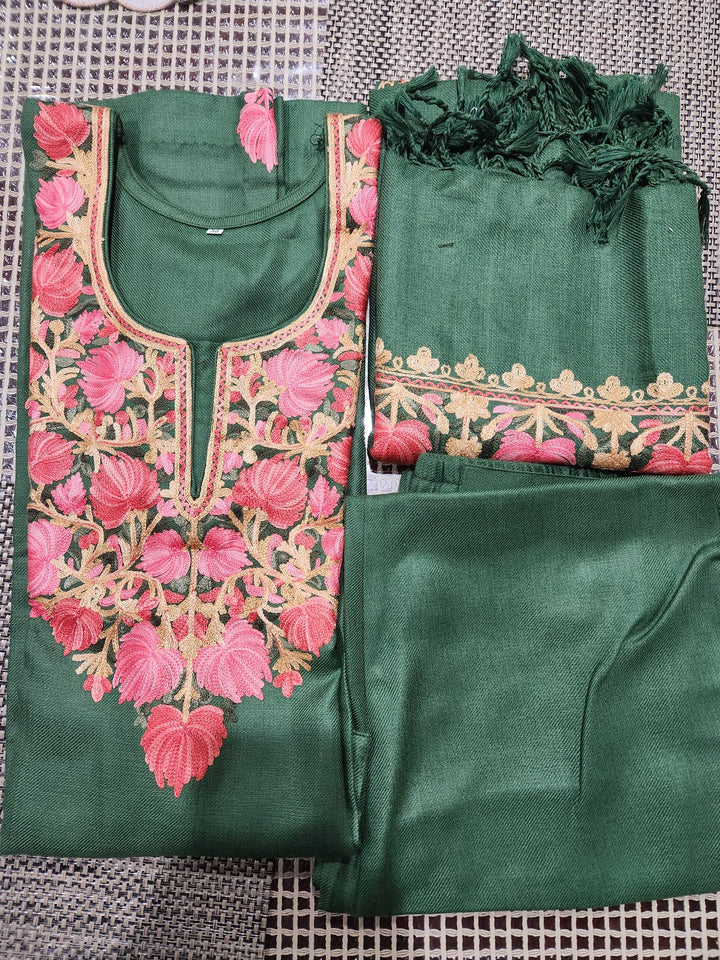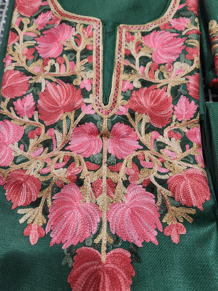 Soft woolen fabric in a deep bottle green shade, adorned with Kashmiri-style floral embroidery in bright pink and golden tones. The embroidery covers the neckline and chest area beautifully, with a matching embroidered border on the woolen shawl.