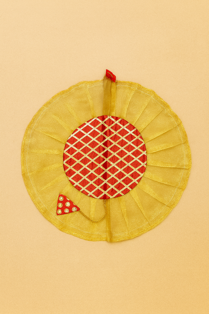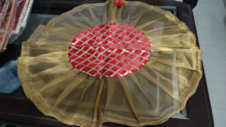 ✨ Elegant and versatile, this Thal Cover that transforms into a Potli is a must-have for festive and wedding rituals. Made from shimmering golden net fabric with intricate gota work in the center, it adds a traditional touch to your celebrations. Measuring 2 ft x 2 ft (approx.), it can be used in multiple ways—covering prasad thals, as an aasan for deity idols, or for creating unique gift hampers. Lightweight and easy to use, it is both practical and decorative for occasions like Ganapati, Diwali, Janmashtami, and weddings.