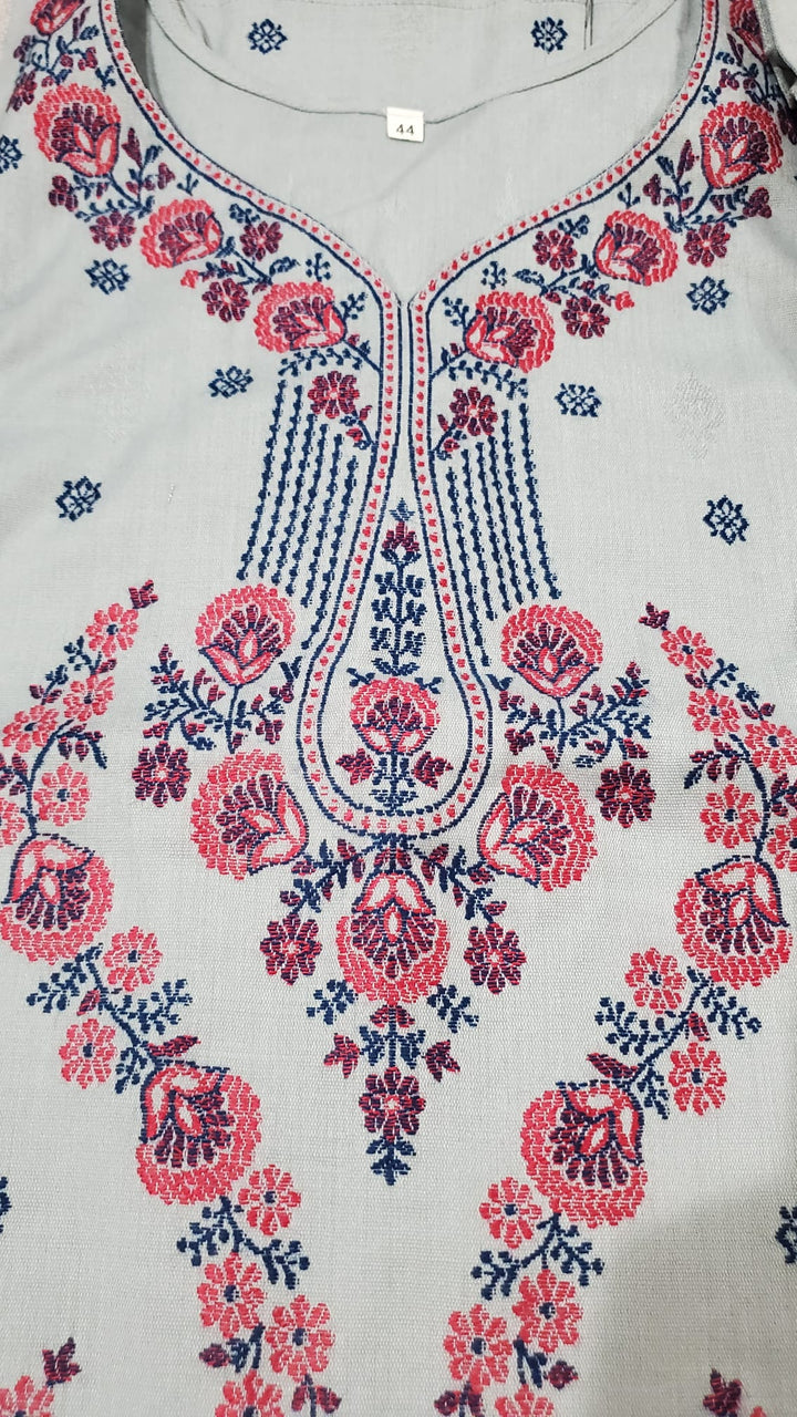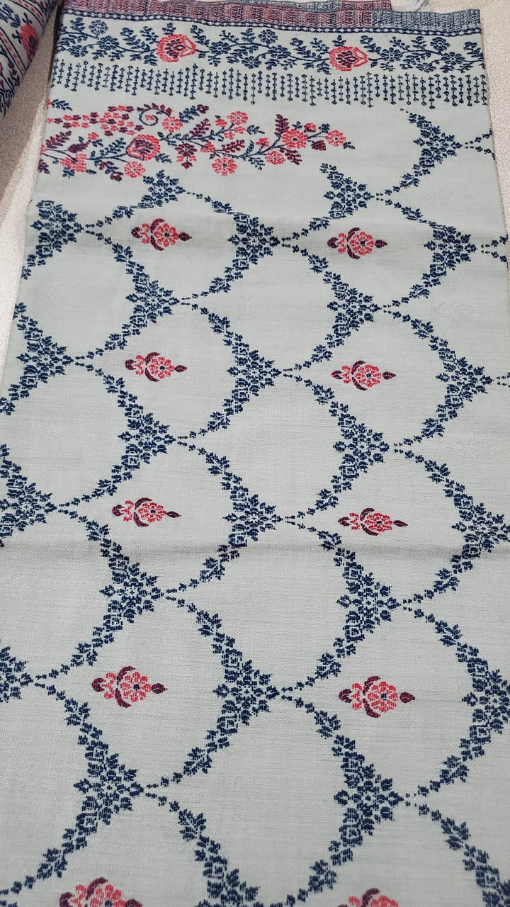 Soft wool blend in a soothing grey shade, beautifully detailed with printed floral motifs in shades of pink and navy blue. Comes with a matching stitched pant and a coordinated printed woolen shawl.