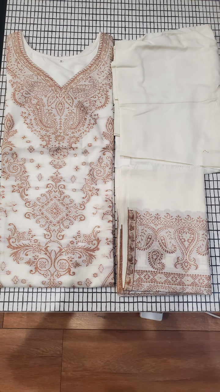✨ Fabric Highlight:Soft and warm wool-blend fabric in a classic white base, adorned with detailed rust-brown paisley and floral print. Comes with a plain stitched pant and a coordinated printed shawl. 🌸 Product Summary:This printed suit is a graceful blend of comfort and elegance. The timeless paisley motifs with floral...