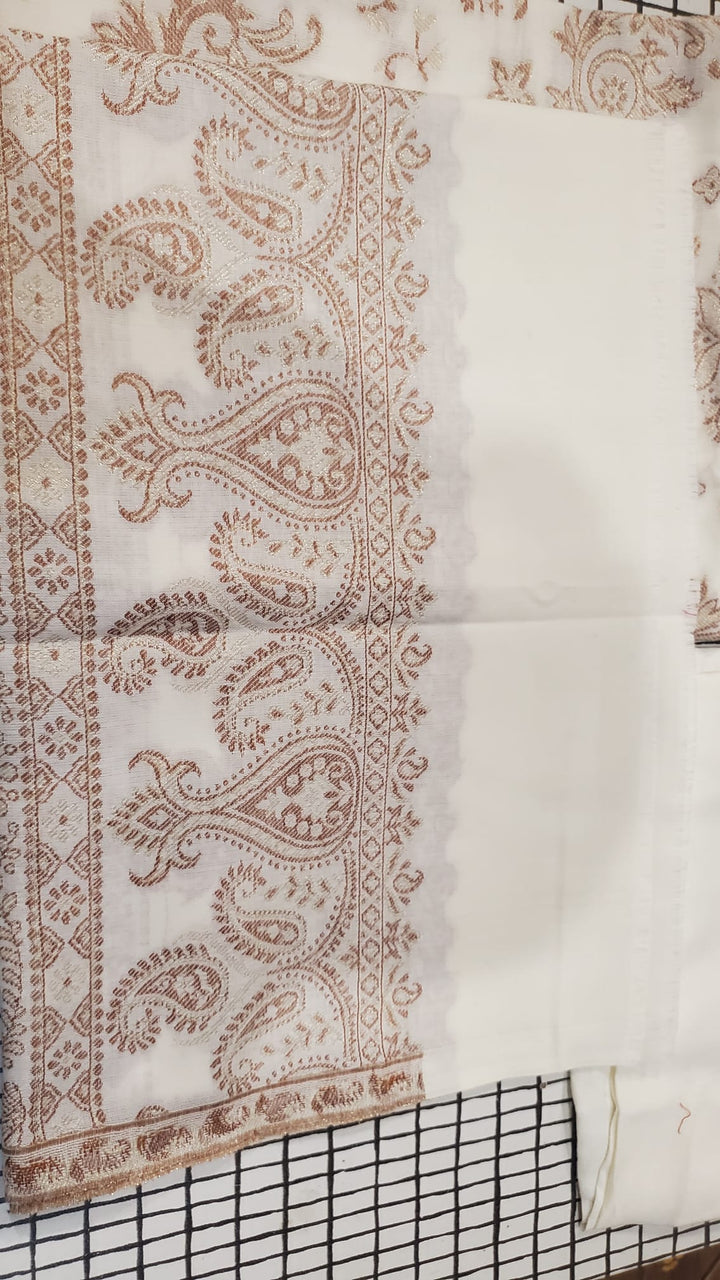 Soft and warm wool-blend fabric in a classic white base, adorned with detailed rust-brown paisley and floral print. Comes with a plain stitched pant and a coordinated printed shawl.