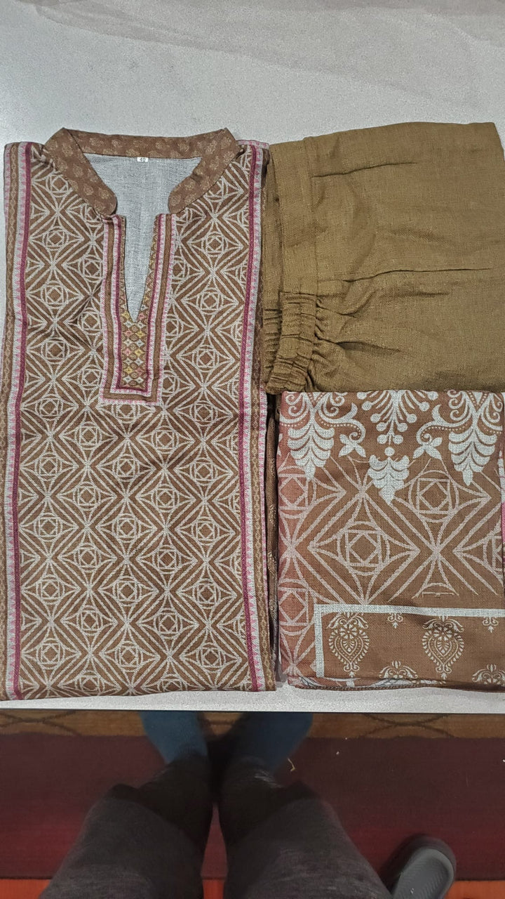 ✨ Fabric Highlight:Warm woolen fabric in earthy brown with geometric and floral print patterns on the kurta, paired with a plain stitched pant in matching tone and a printed woolen shawl that complements the set. 🌸 Product Summary:This suit brings together earthy elegance with comfort. The subtle brown tones highlighted...