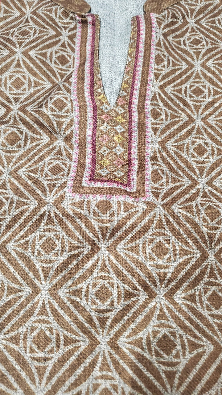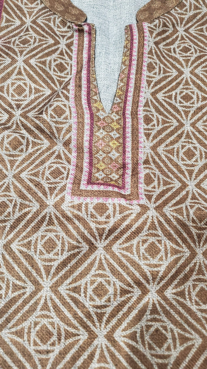 Warm woolen fabric in earthy brown with geometric and floral print patterns on the kurta, paired with a plain stitched pant in matching tone and a printed woolen shawl that complements the set.