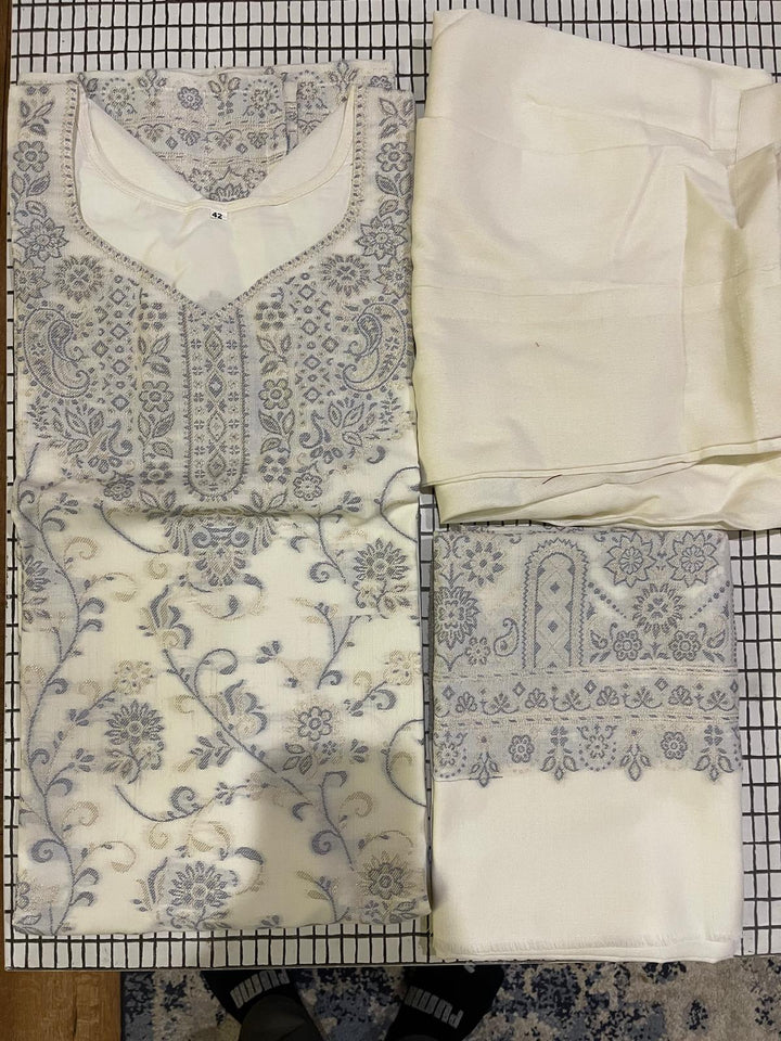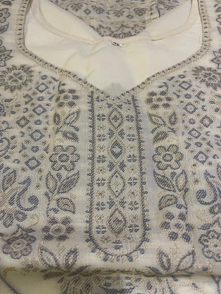 ✨ Fabric Highlight:Soft wool-blend fabric in ivory, adorned with elegant grey floral and vine prints. Comes with a plain stitched pant in matching ivory and a coordinated printed shawl. 🌸 Product Summary:A graceful printed woolen suit that combines sophistication with comfort. The ivory base gives it a serene appeal, while...