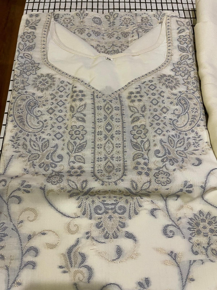 A graceful printed woolen suit that combines sophistication with comfort. The ivory base gives it a serene appeal, while the delicate grey motifs add a refined, understated charm.