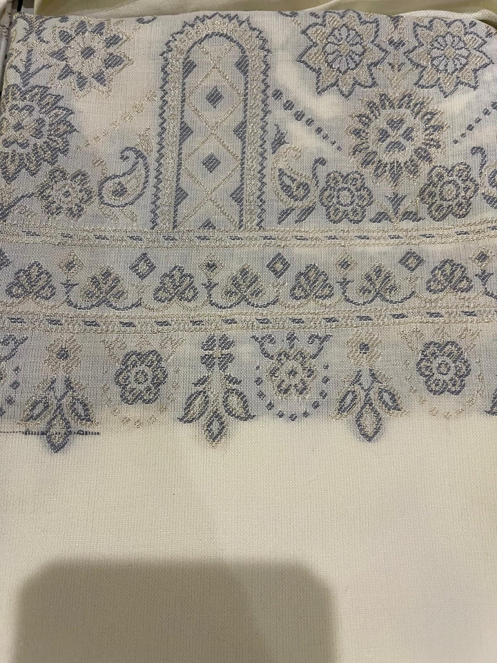 Printed Woolen Suit with Shawl – Ivory with Grey Floral Motifs