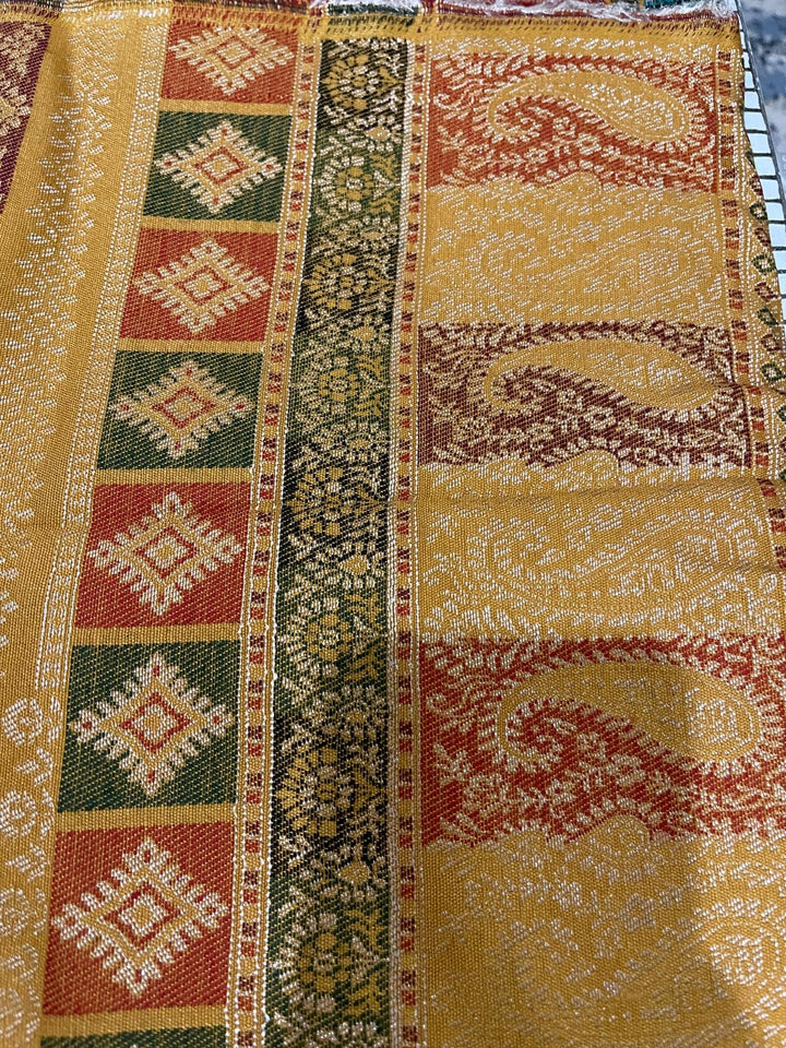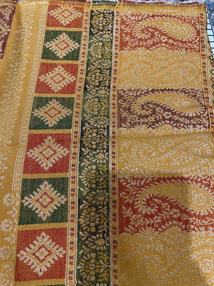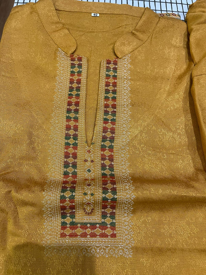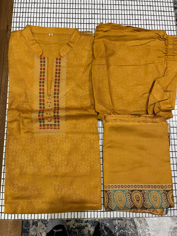 ✨ Fabric Highlight:Wool-blend fabric in a rich mustard yellow, featuring subtle woven self-patterns on the kurta, a plain matching stitched pant, and a printed woolen shawl with intricate border motifs in green and maroon. 🌸 Product Summary:This printed woolen suit is a perfect mix of bold and classic. The mustard...