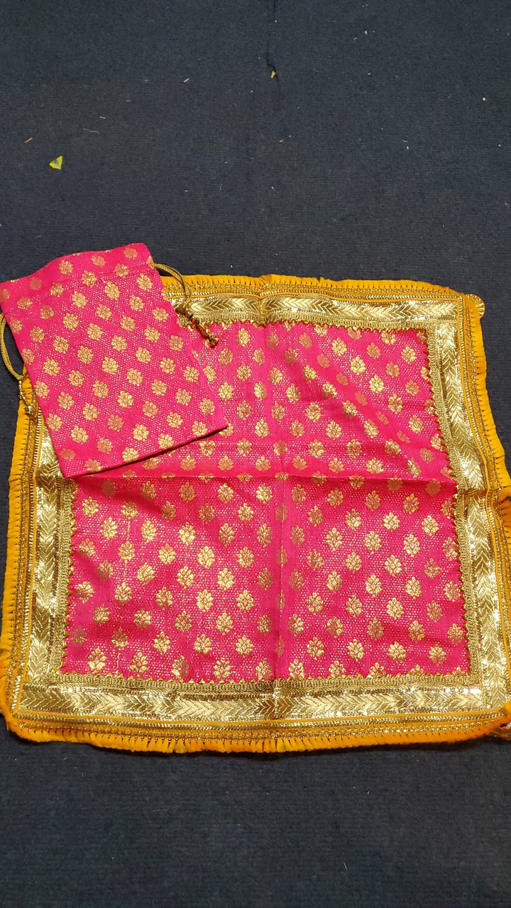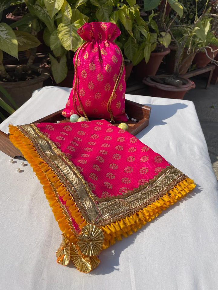 🌸 Add a touch of elegance to your festive and traditional celebrations with this beautiful combo set consisting of a stylish potli and a matching thal cover. Designed in a bright pink base with golden motifs, this set is adorned with a golden lace border and vibrant yellow frill detailing, giving it a rich and festive appeal.