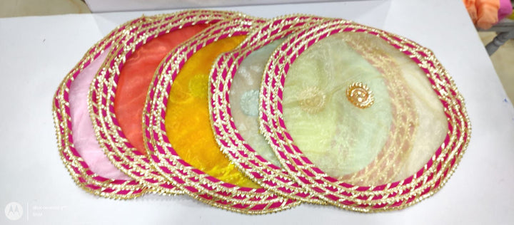 Add a festive touch to your puja and celebrations with this beautiful 18-inch thal cover. Designed with a delicate net fabric in the center and finished with intricate gota work on the edges, it blends elegance with tradition.