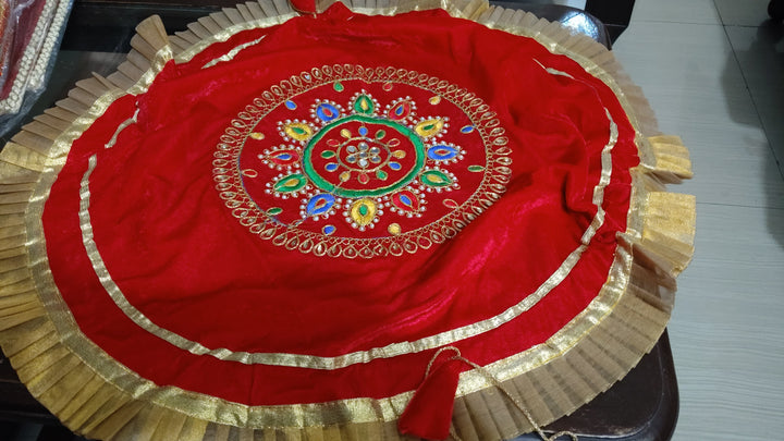 🌟 Bring richness and tradition to your rituals with this Velvet Thal Cover that also converts into a Potli. Made from luxurious red velvet, it features intricate multicolor embroidery and stone embellishments, highlighted with a golden border for a regal touch. Measuring 2 ft x 2 ft (approx.), this versatile piece is ideal for covering prasad thals, using as an aasan for deity idols, or as a decorative potli for festive gifting and hampers. The bright embroidery adds a festive charm, making it perfect for Ganapati, Diwali, Navratri, Janmashtami, weddings, and special puja ceremonies.